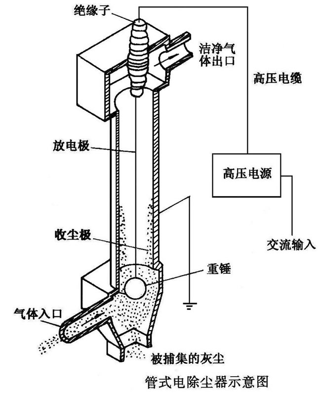 單管電除塵器結(jié)構(gòu)如圖所示。集塵極為150-300mm的圓形金屬管,管長(zhǎng)為3-5m。放電極線(電暈線)用重錘懸吊在集塵極園管的中心。管式電除塵器電場(chǎng)強(qiáng)度高且變化均勻,但清灰比較困難。常用于處理含塵氣體量小或含霧滴的氣體。