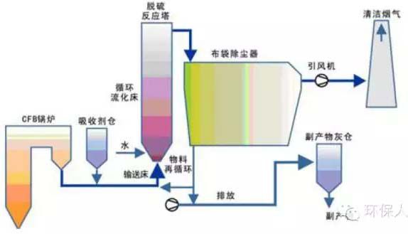 以循環(huán)流化床原理為基礎(chǔ),通過(guò)物料的循環(huán)利用,在反應(yīng)塔內(nèi)吸收劑、吸附劑、循環(huán)灰形成濃相的床態(tài),并向反應(yīng)塔中噴入水,煙氣中多種污染物在反應(yīng)塔內(nèi)發(fā)生化學(xué)反應(yīng)或物理吸附;經(jīng)反應(yīng)塔凈化后的煙氣進(jìn)入下游的除塵器,進(jìn)一步凈化煙氣。此時(shí)煙氣中的SO2和幾乎全部的SO3,HCl,HF等酸性成分被吸收而除去,生成CaSO3•1/2H2O、CaSO4•1/2H2O等副產(chǎn)物。